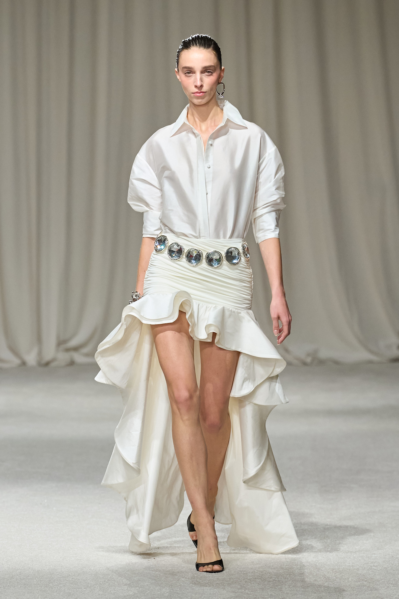 قدمت دار Saint Laurent القميص الأبيض بأسلوب مبتكر مع أكتاف بارزة وربطة كبيرة في الأمام، وتم تنسيقه مع تنورة جلدية سوداء وحذاء فضي بكعب عالٍ، ما أضفى على الإطلالة طابعاً قوياً وملفتاً.