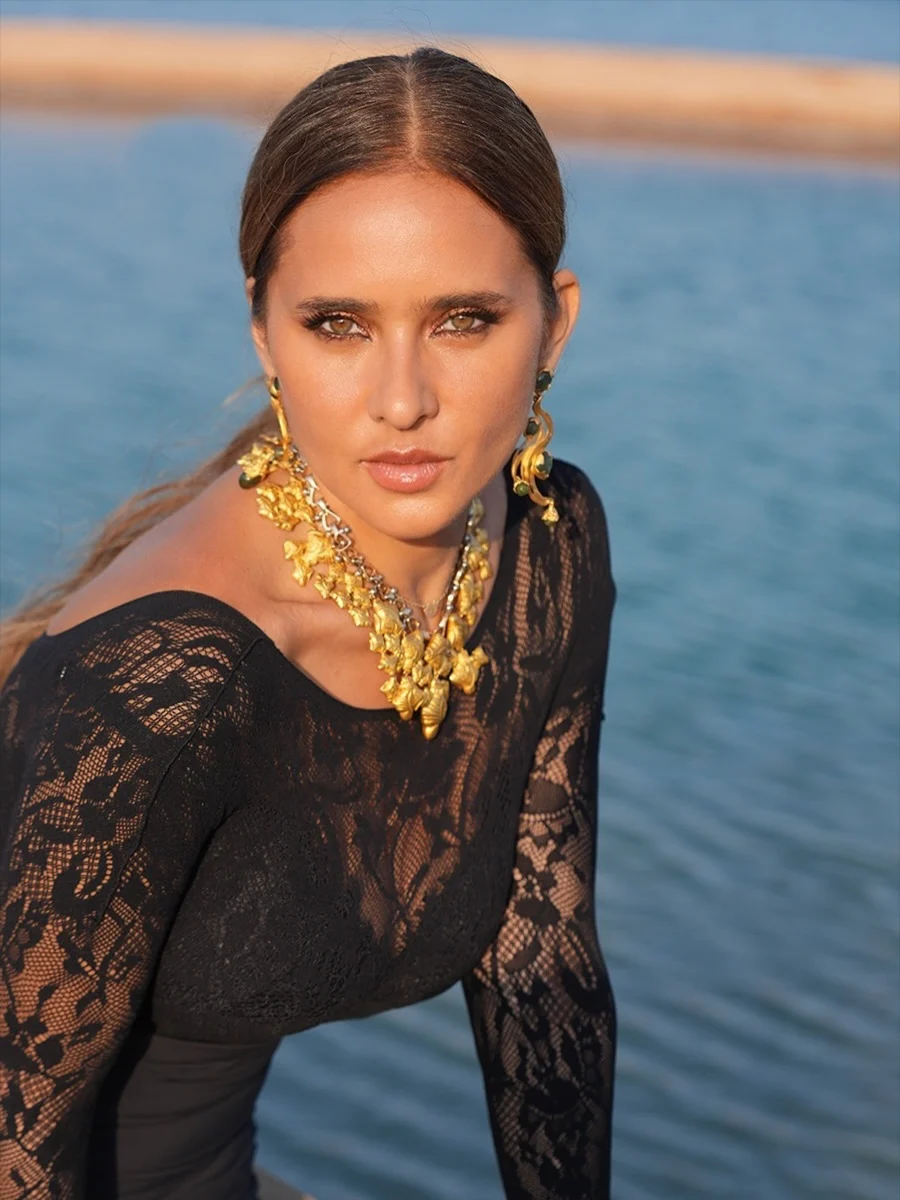 ولتعزيز الطابع الدرامي، نسّقت نيللي كريم مع الفستان معطفاً طويلاً باللون الأسود بلمسة لامعة وقصة انسيابية، ما أضفى على الإطلالة بُعداً فخماً وجعلها أكثر حضوراً. كما اختارت مجوهرات ذهبية بأسلوب Statement Pieces، جاءت بارزة وجريئة لتكمل المشهد بإحساس فاخر يعكس قوة الشخصية.
