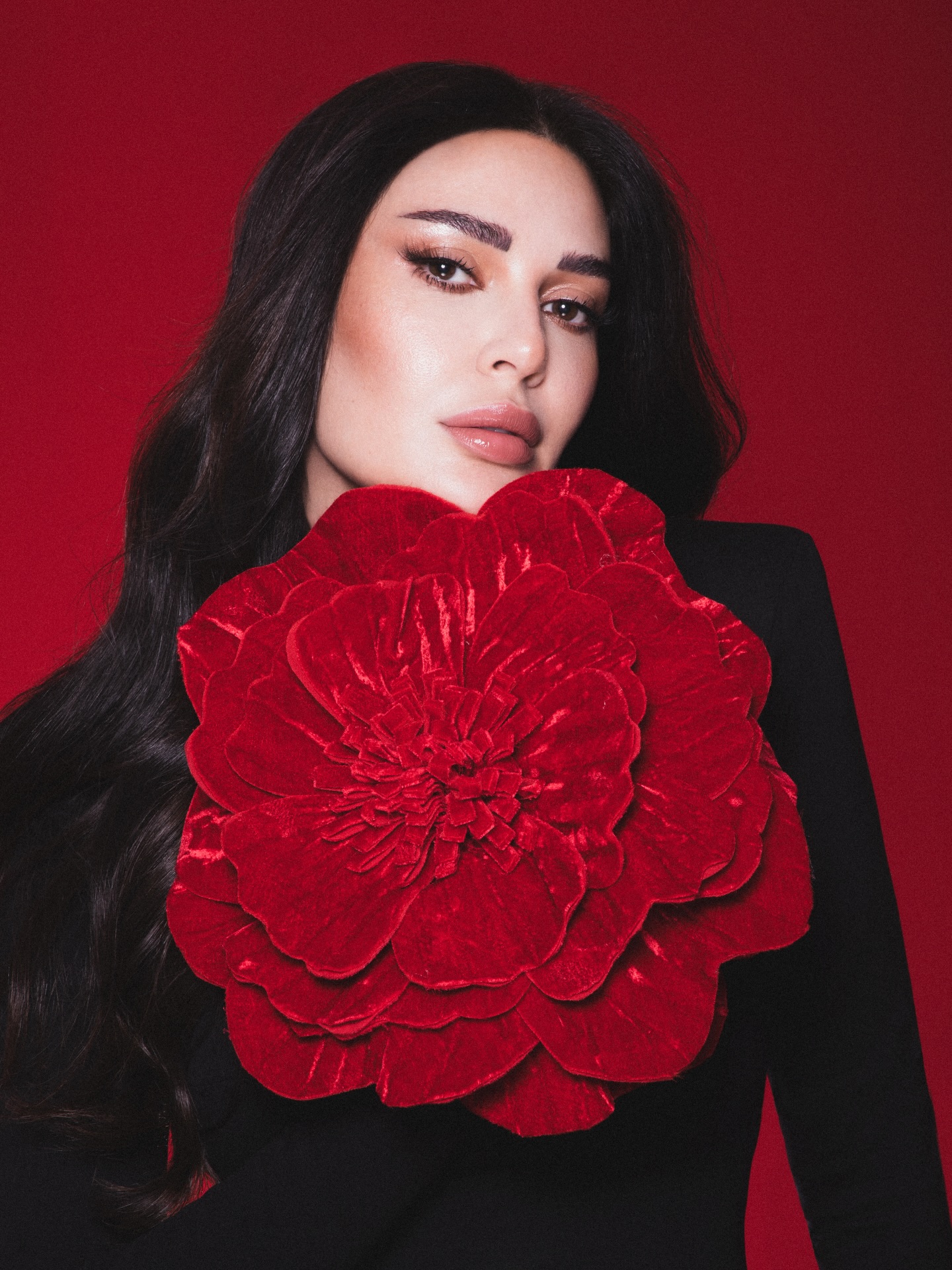 وفي جلسة تصوير غلب عليها اللون الأحمر، اختارت سيرين مجوهرات مرصعة بالياقوت الأحمر والألماس من دار Tahan Jewelry، لتتناغم مع أجواء الإطلالة الرومانسية.