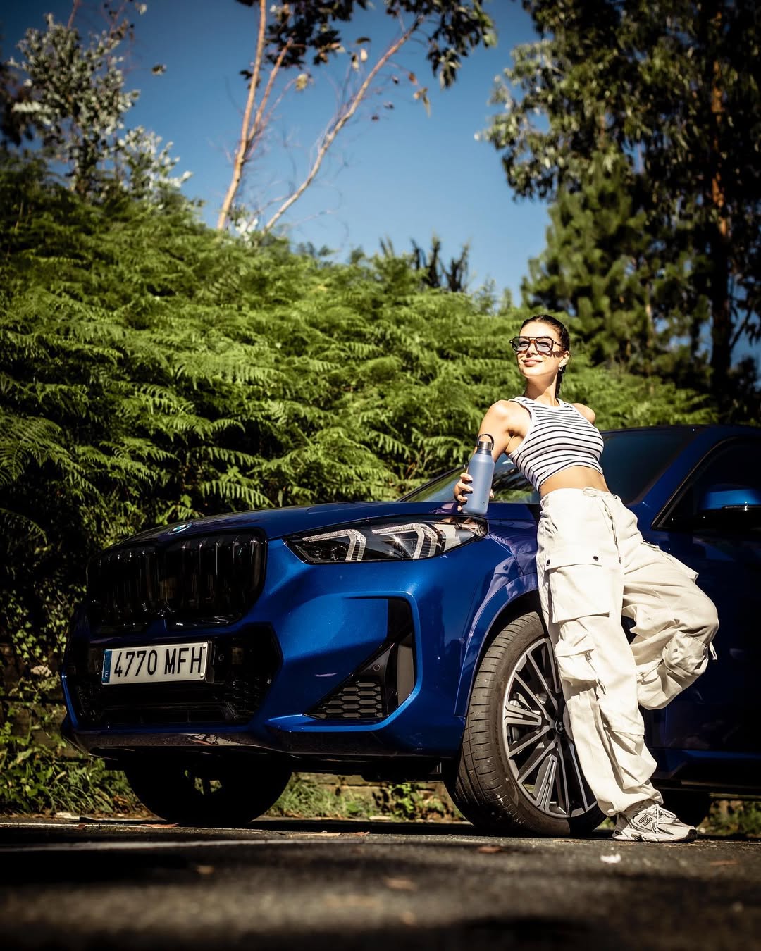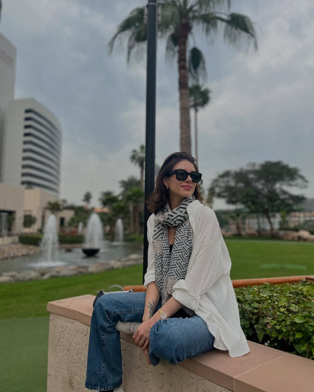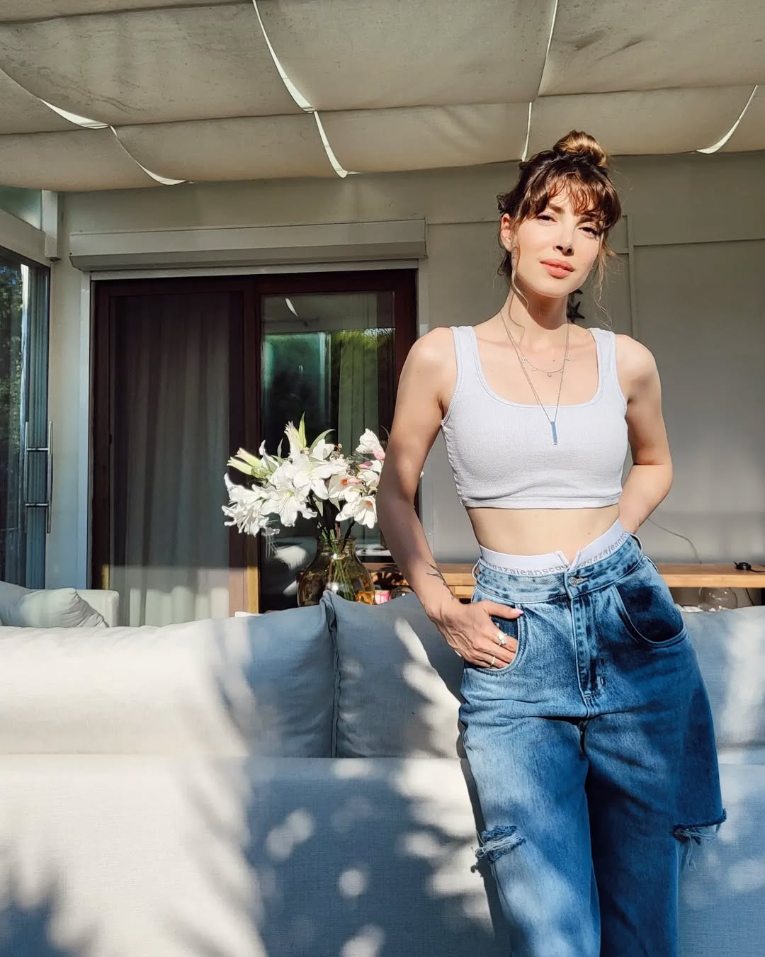 حتى الإطلالات العفوية تحت أشعة الشمس لم تغب عن أسلوبها، حيث ارتدت بنطال جينز واسع مع كروب توب أبيض، ورفعت شعرها بعفوية على شكل كعكة عالية.