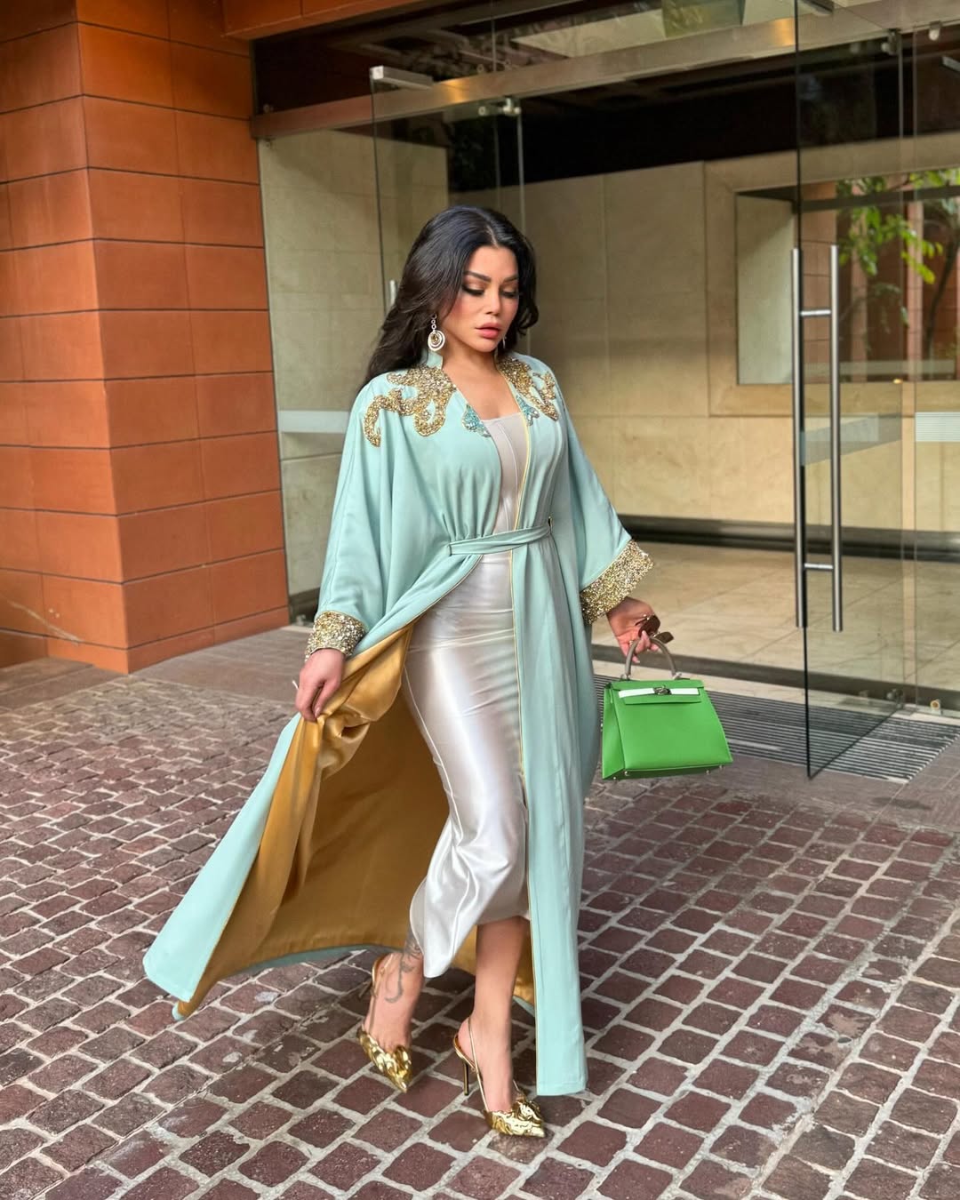 اعتمدت هيفاء وهبي أيضًا إطلالة شرقية أنيقة باللون الأخضر الشاحب، عبارة عن عباية مفتوحة مطرزة بالخرز الذهبي عند الكتفين والمعصمين، نسقتها مع فستان حريري ضيق باللون الأبيض، وحذاء ميتاليك ذهبي، إضافة إلى حقيبة يد خضراء وأقراط ماسية مع شعر ويفي منسدل.