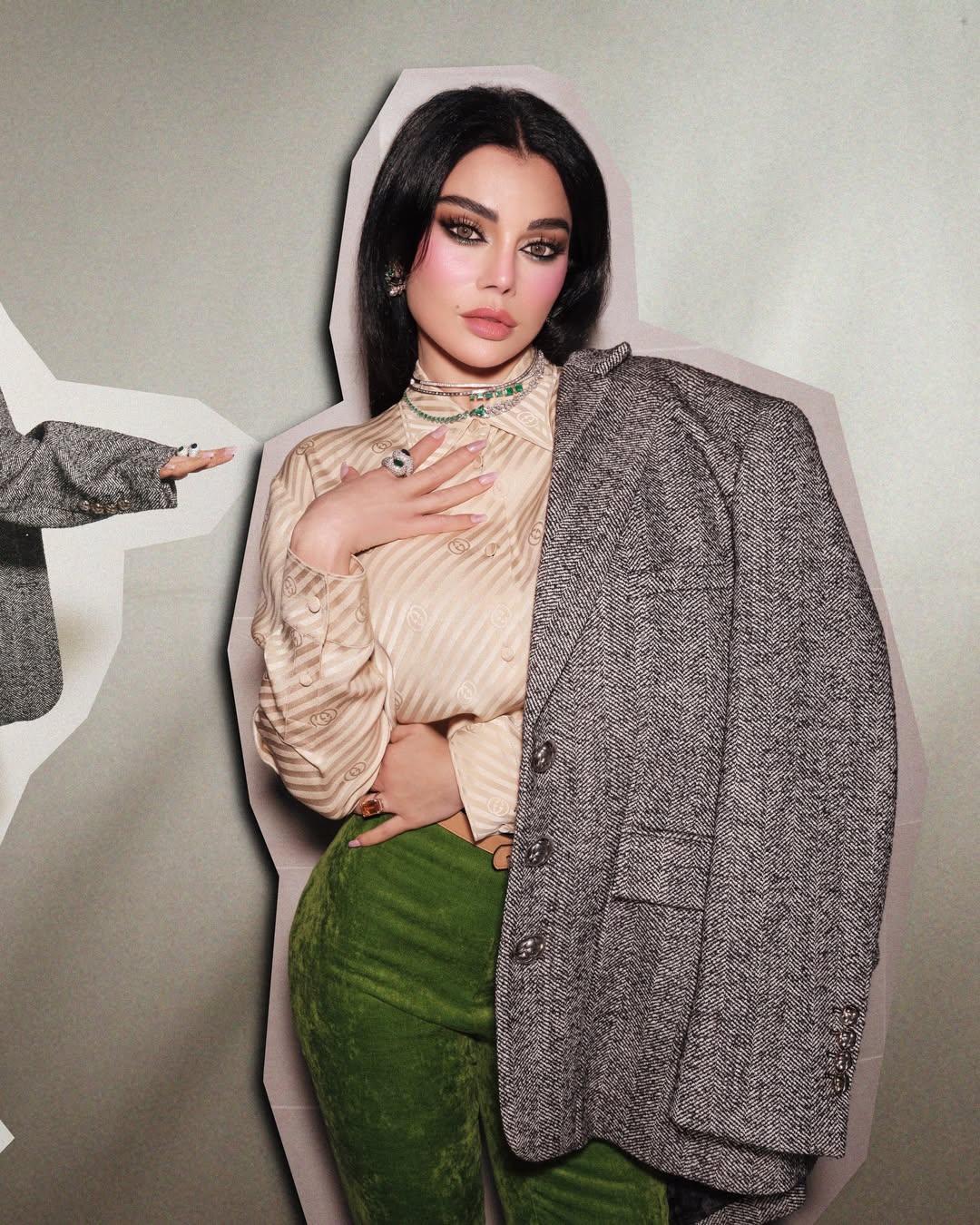وجاءت الإطلالة ببنطال مخملي ضيق باللون الأخضر عالي الخصر، نسقته مع قميص حريري مخطط بلون نيود فاتح بقصة واسعة مطبوعة بشعار الدار. كما ارتدت فوقه بليزر أوفرسايز باللون الرمادي مزينًا بنقشة الشيفرون الأيقونية.