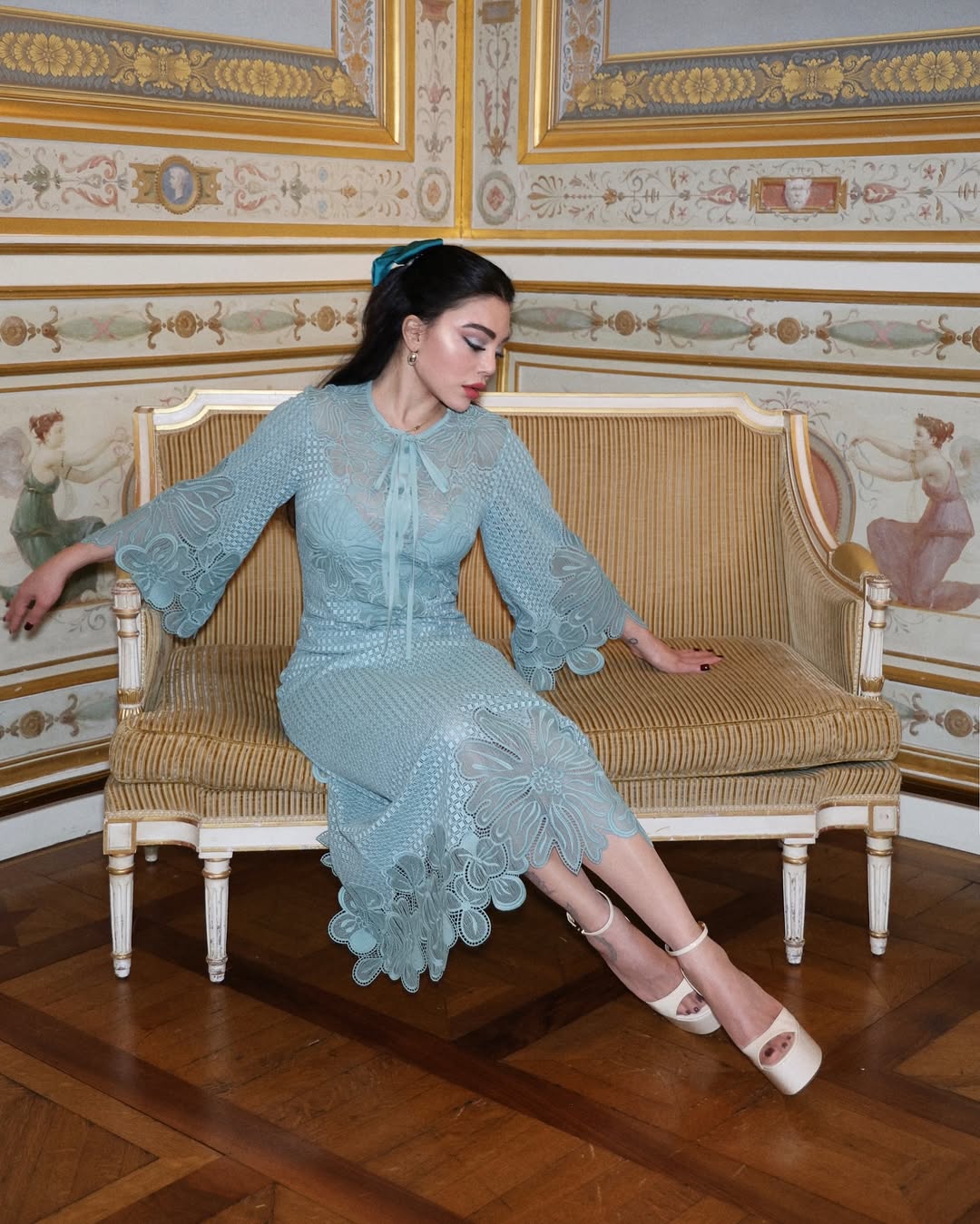 وتميز التصميم بخصر محدد وأكمام واسعة مع فتحة ياقة دائرية تتوسطها عقدة وأزرار، ونسّقت معه حذاء بلاتفورم أبيض من Valentino. كما زينت شعرها الويفي بفيونكة واكتفت بأقراط معدنية وعقد رفيع.