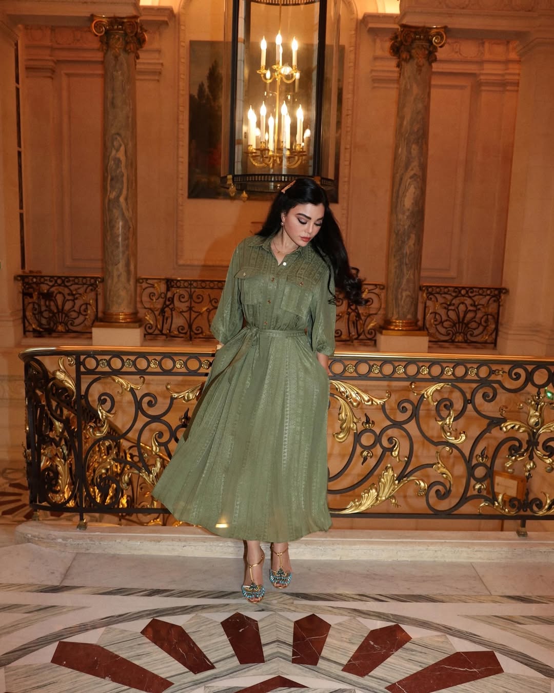 كما اختارت فستانًا آخر باللون الأخضر الداكن من تصميم إيلي صعب، جاء بطول يعلو الكاحل مع أكمام طويلة وفتحة ياقة مزينة بأزرار أمامية وحزام يحدد الخصر. وانسدل الفستان بقصة واسعة من قماش منقوش بطبعة هندسية تعكس الضوء بهدوء، وأكملت إطلالتها بحذاء كلاسيكي بتصميم شبكي مزين بأربطة ذهبية مرصعة، مع شعر مموج منسدل.