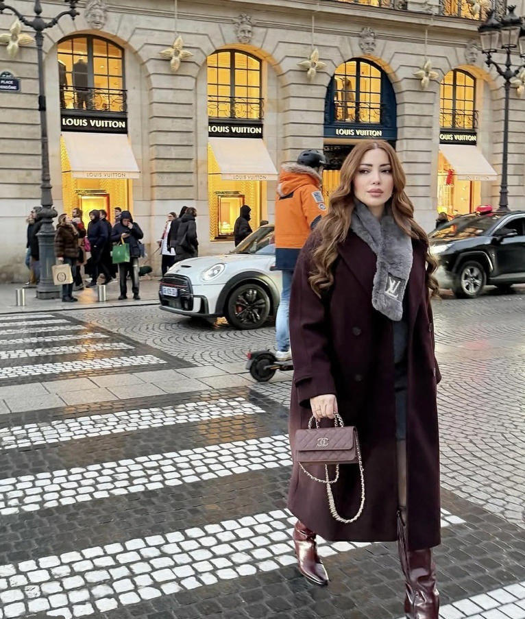 لمسة من الدفء والترف، فكان بمثابة قطعة رئيسية تضيف أبعاداً أنيقة لإطلالتها. ولم تكتفِ بذلك، حيث اختارت حقيبة صغيرة من "Chanel" حملت طابعاً عصرياً يعبر عن حبها للتفاصيل الدقيقة، وانسجمت كل هذه العناصر مع الخلفية الباريسية الساحرة لتبدو وكأنها أيقونة موضة متألقة لا تنسى.