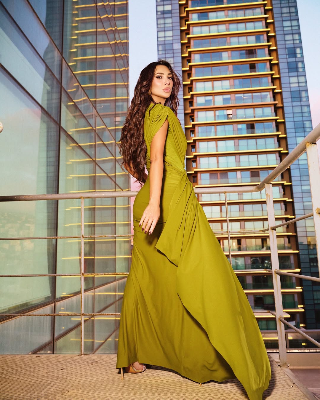 اختارت النجمة السورية نور علي فستانًا طويلًا باللون الأخضر الزيتي، بقصة Bodycon تحدد القوام برشاقة، وقماش مضلع بخطوط عرضية دقيقة أضافت عمقًا للتصميم. الفتحة الأمامية على شكل V والأربطة الرقيقة عند الكتفين مع ظهر مكشوف منح الفستان لمسة عصرية.