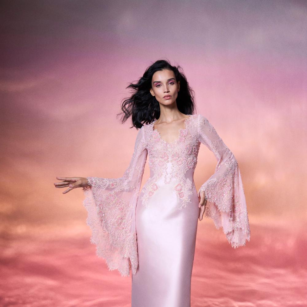 إطلالة مسائية تقوم على فستان حريري بلون وردي مغبر مع تفاصيل لؤلؤية ومكياج طبيعي يعزز الهدوء بدل المبالغة.