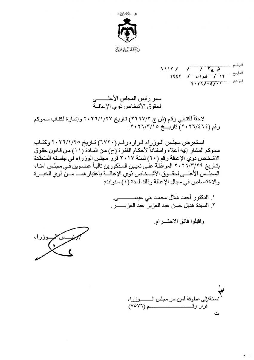للعلّم - قرر مجلس الوزراء في جلسته التي عقدها يوم 29 آذار 2026 ، الموافقة على تنسيب رئيس المجلس الأعلى لحقوق الأشخاص ذوي الإعاقة سمو الامير مرعد بن رعد بن زيد، بتعيين الدكتور أحمد هلال بني عيسى وهديل حسن عبدالعزيز عضوين في مجلس أمناء المجلس.