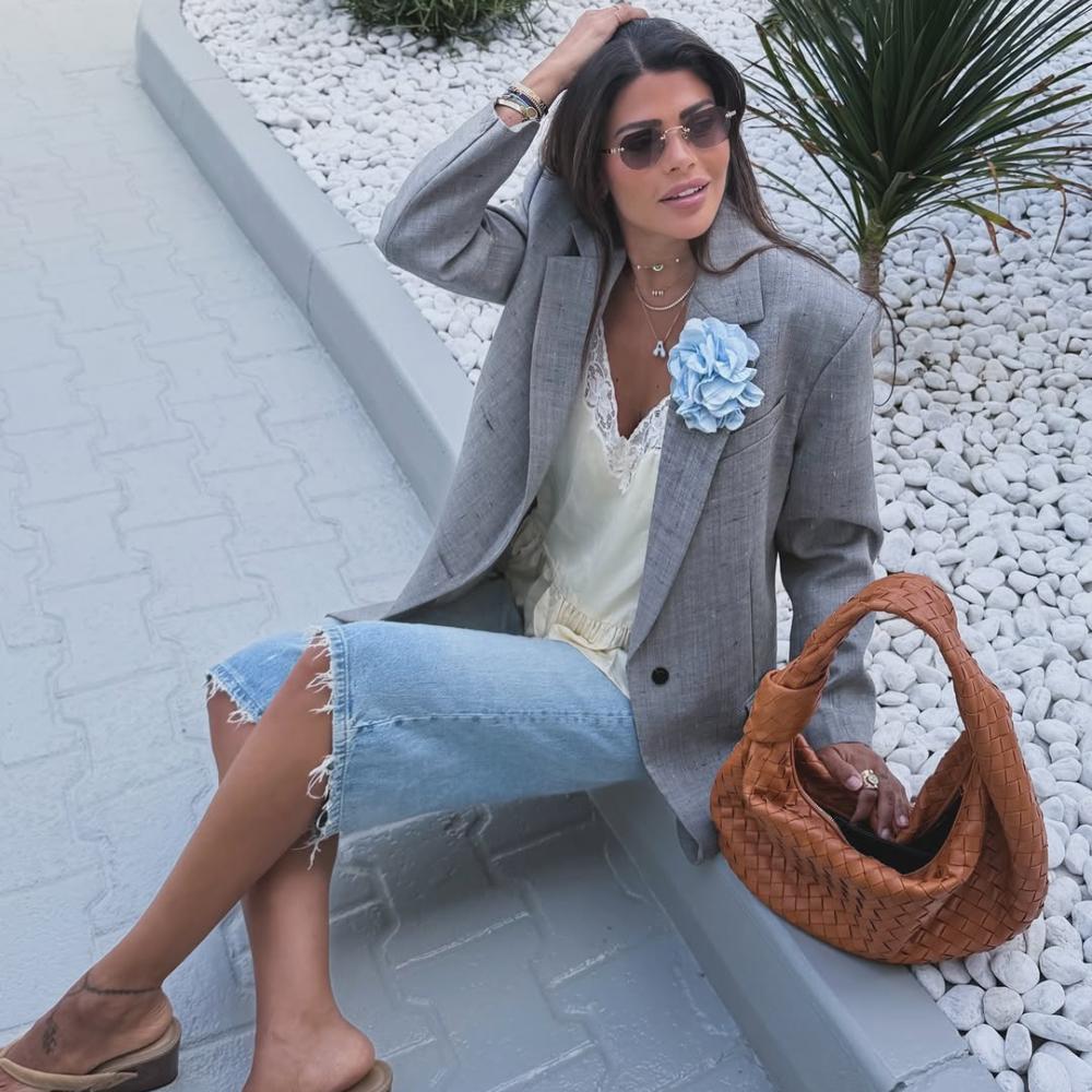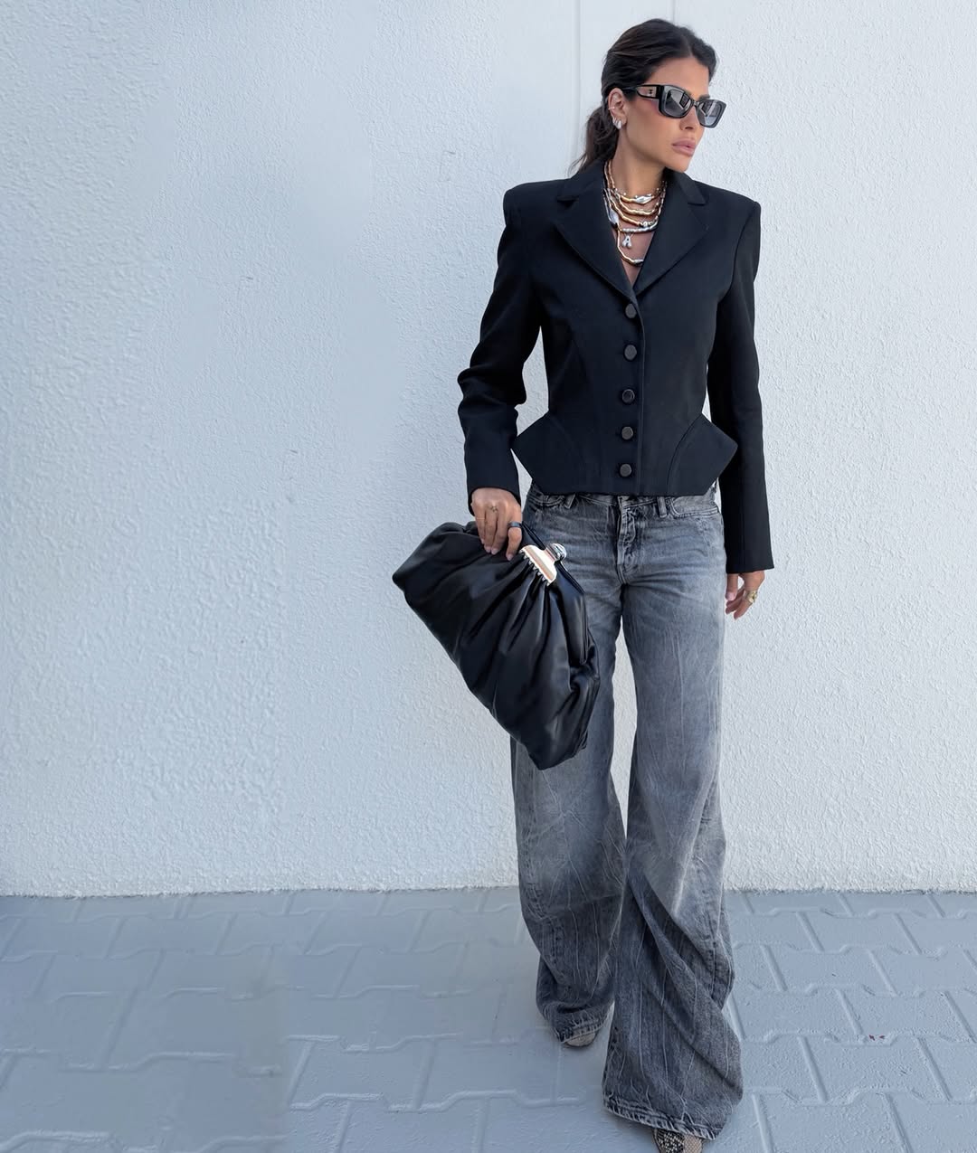 نسّقتها مع بليزر “أوفر سايز” ولمسة أنثوية ناعمة، لتثبت أن السر ليس في القطعة نفسها، بل في طريقة تقديمها.