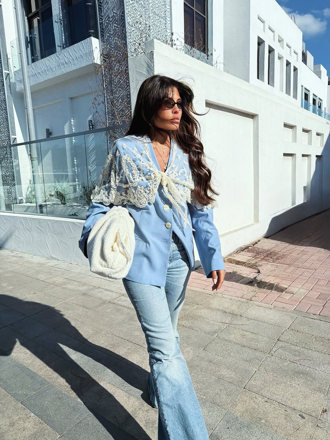 جينز سماوي واسع مع بليزر مزين بتفاصيل دانتيل ضخمة منح الإطلالة طابعاً يجمع بين الكلاسيكية والحداثة، وكأنها خرجت من لوحة قديمة… لكن بهوية معاصرة.