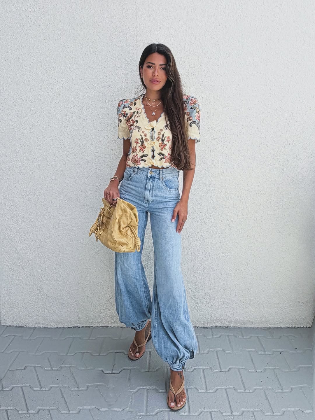 الجينز الواسع مع “Crop Top” مزهر خلق إطلالة مليئة بالطاقة، تشبه صباحاً مشمساً لا يحتاج إلى قهوة إضافية.