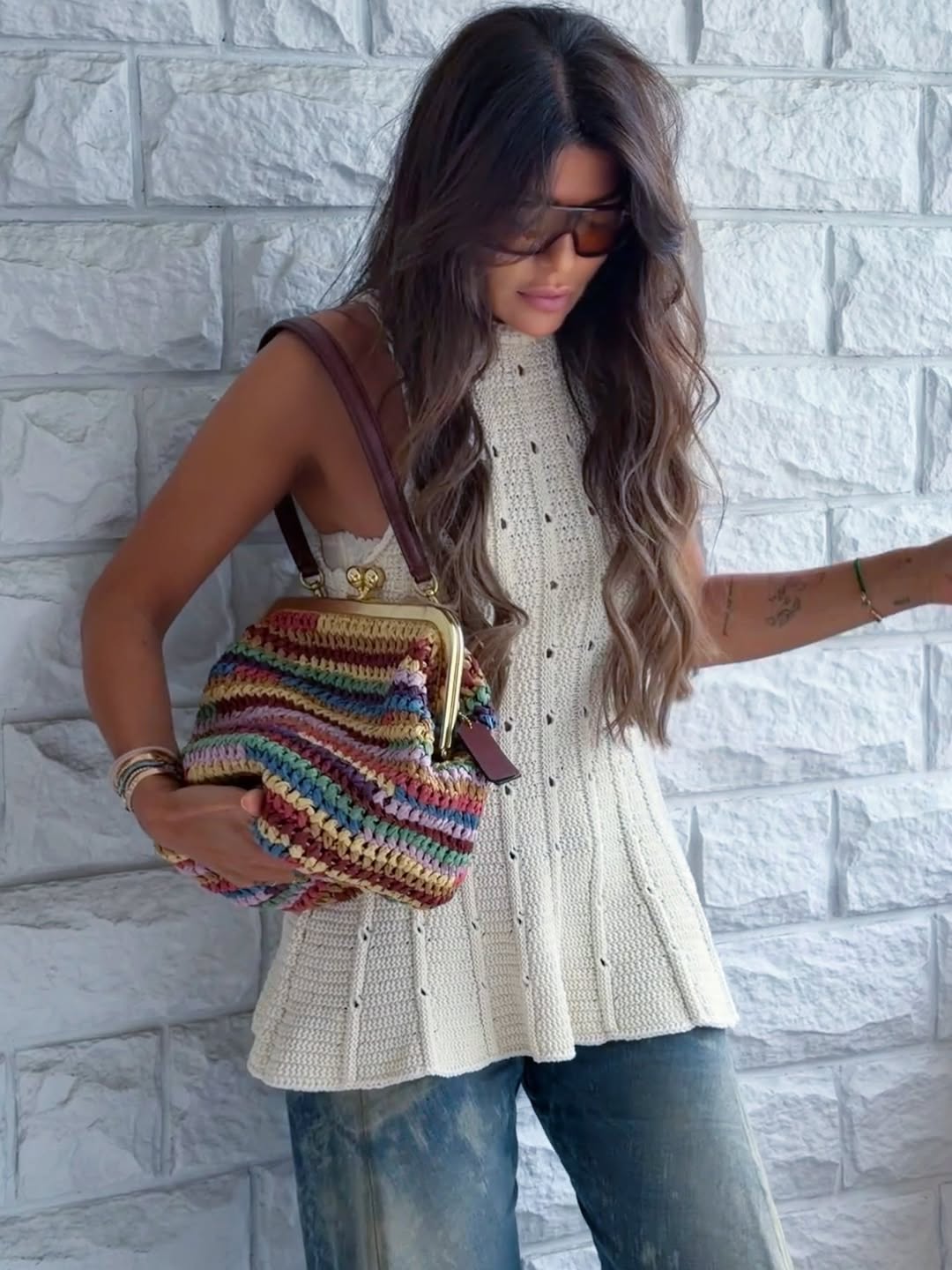 أما الإطلالة الأكثر عفوية، فجاءت مع توب كروشيه وجينز مريح بقصة مستقيمة.