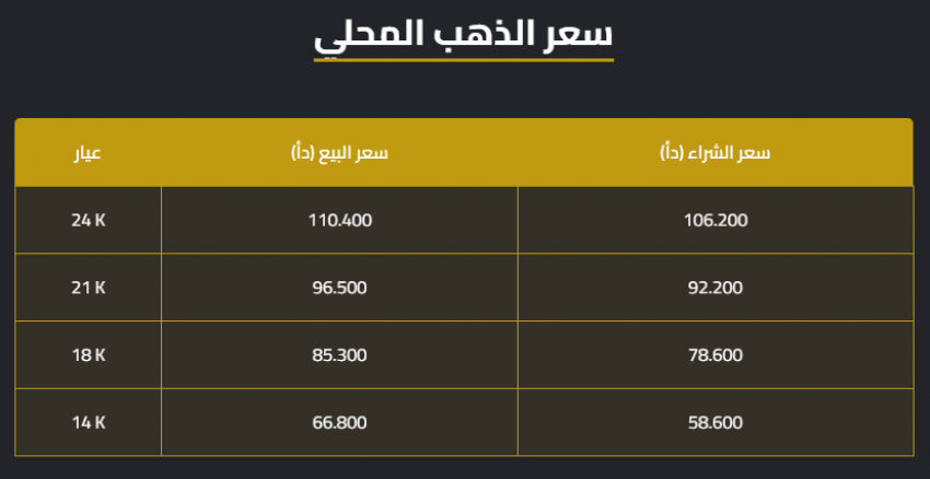 فيما بلغ سعر الغرام الواحد من الذهب عيارات 24 و18 و14 لغايات البيع من محالّ الصاغة 110.40 دنانير و85.30 و66.80 دينارا على الترتيب.