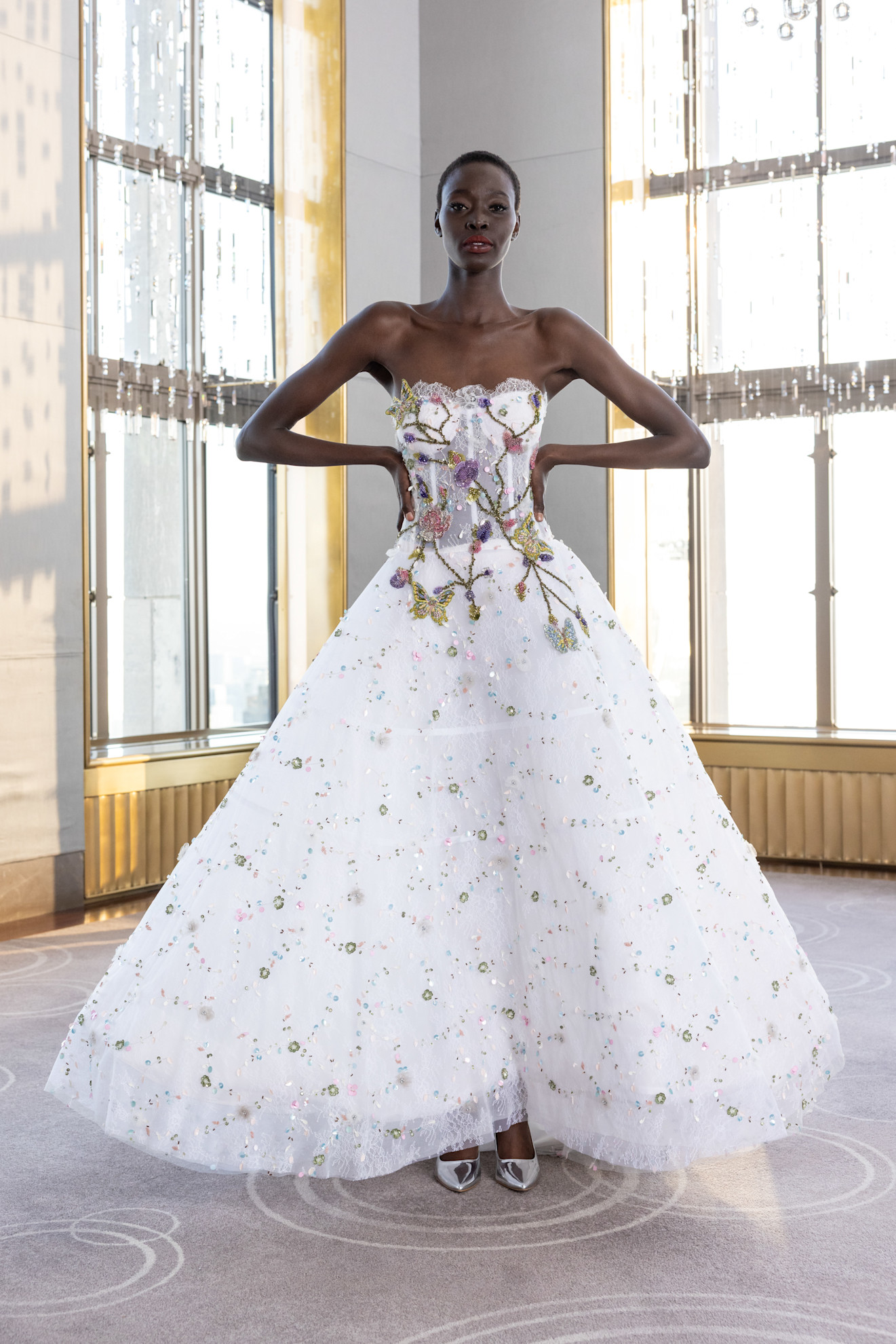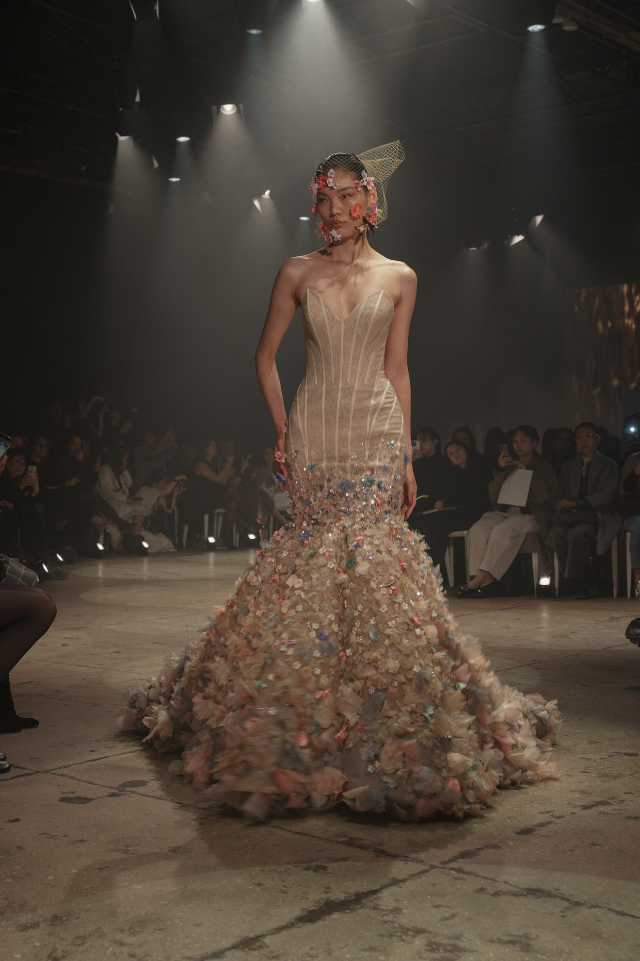 الزهور ثلاثية الأبعاد تتفتح على الأقمشة، والكريستالات تعكس الضوء كنجوم صغيرة، لتبدو الفساتين وكأنها لوحات حيّة.