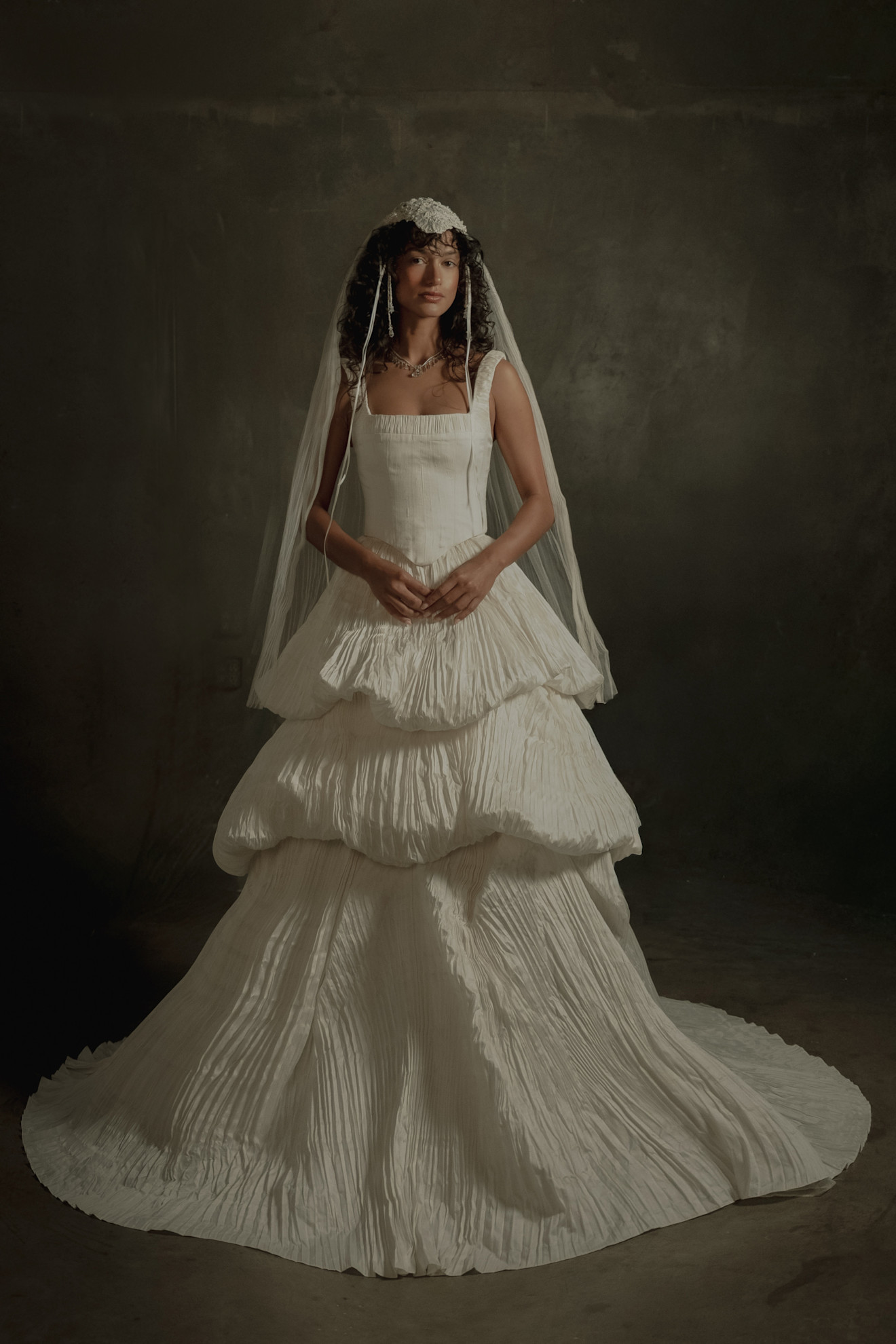 تعود الفساتين متعددة الطبقات بأسلوب أخف وأكثر انسيابية، حيث لم تعد الطبقات مجرد حجم، بل عنصرًا يعبّر عن الحركة. تنسدل خامات التول والشيفون بانسياب يمنح الفستان حياة، وكأن كل خطوة للعروس تحكي جزءًا من قصتها.