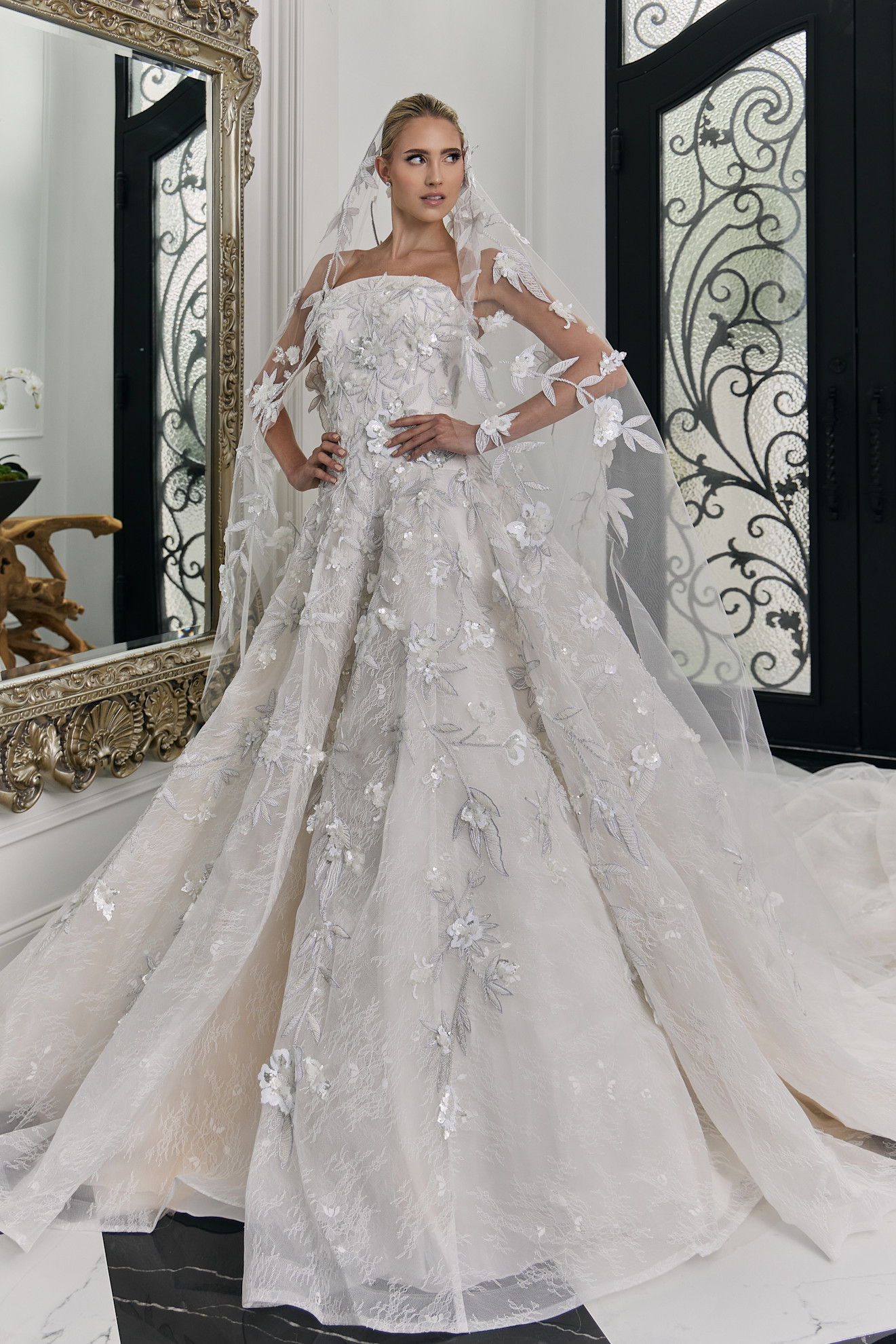تواصل الزهور حضورها، لكن بأسلوب أكثر تطورًا، حيث تظهر بتلات ثلاثية الأبعاد تضيف عمقًا ملمسيًا وحيوية، وكأن الفستان حديقة متحركة تعكس رقة العروس وحيويتها.