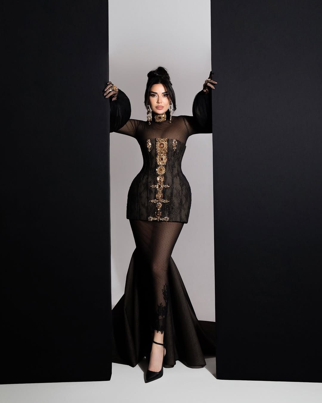 وفي جلسة تصوير أخرى، أطلت سيرين بفستان أسود من توقيع Khaled & Marwan، جمع بين الكورسيه والتل المطرز والأكمام الطويلة. التصميم جاء غنيًا بالتفاصيل، من الكشكش المنتفخ إلى ذيل الحورية المنسدل، ليقدم لوحة درامية كاملة من الأنوثة الراقية.