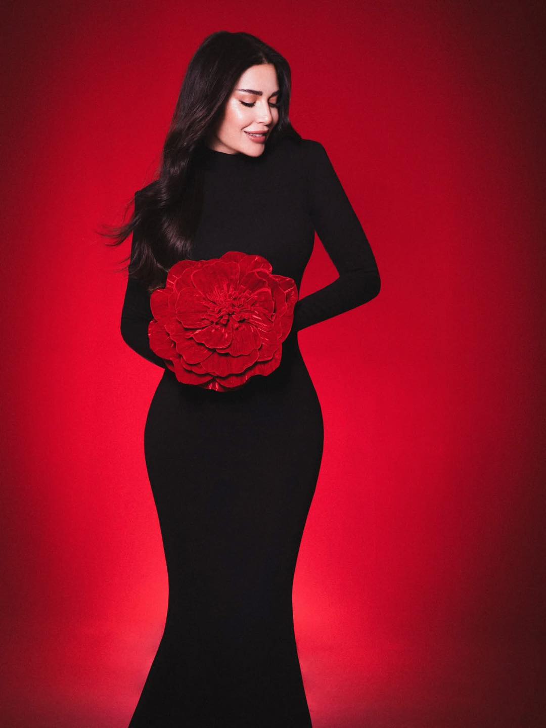 في جلسة تصوير سابقة، ظهرت سيرين بفستان أسود مجسم من توقيع أنطوان قارح، جاء بتصميم كلاسيكي يبرز القوام مع قفازات طويلة. لكن المفاجأة كانت في إكسسوار وردة حمراء ضخمة كسرت هدوء اللون الأسود، لتمنح الإطلالة طابعًا جريئًا ومميزًا في آن واحد.