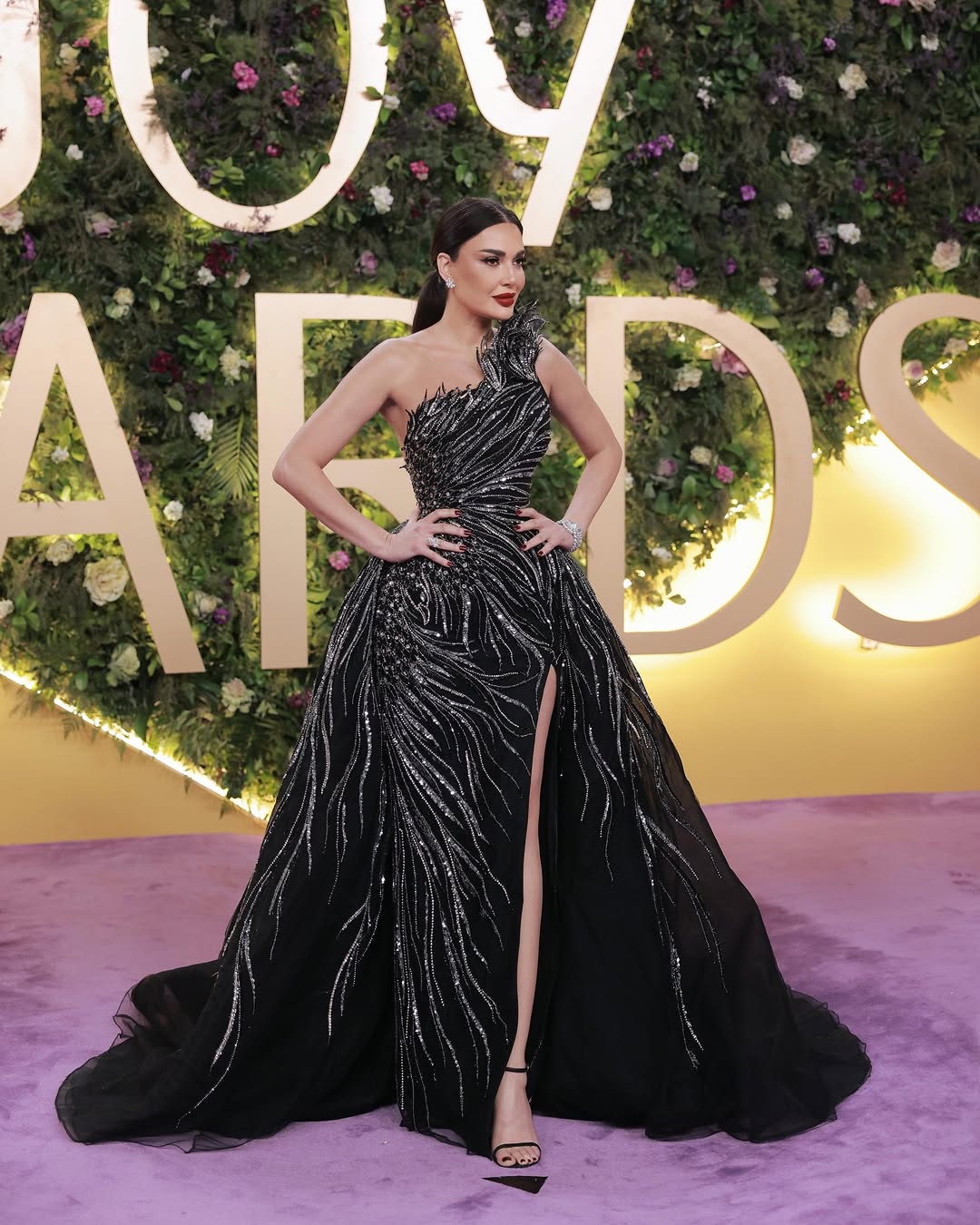 ومن أبرز إطلالاتها، فستان أسود فاخر من توقيع زهير مراد، تميز بقصة ضيقة مع فتحة ساق جانبية وكاب خلفي طويل مزين بتطريزات كريستالية فضية. إطلالة لامعة جمعت بين القوة والبريق، واكتملت بحذاء بكعب عالٍ وتسريحة ذيل الحصان ومجوهرات ماسية بسيطة.