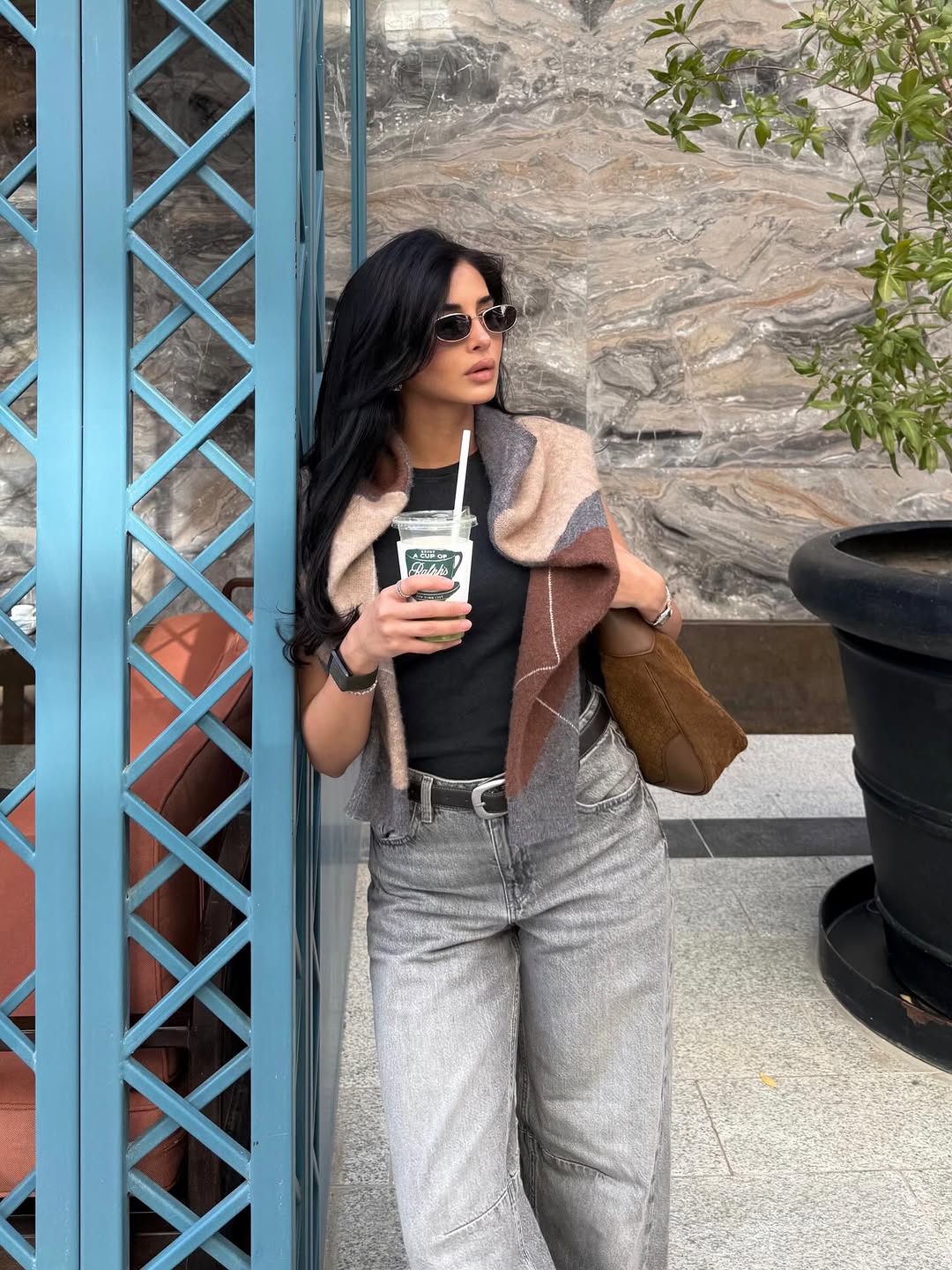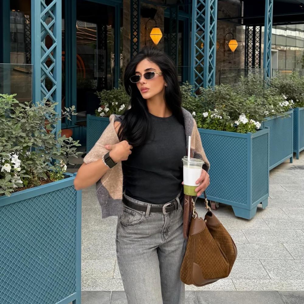 قدمت رهف الحربي إطلالة هادئة تعتمد على بنطال جينز رمادي واسع مع توب أسود بسيط، أضيف إليه حزام ناعم يحدد الخصر. وبرزت لمسة الجاكيت الصوفي الملقى على الأكتاف بألوان دافئة، ما منح اللوك عمقًا بصريًا مناسبًا لأجواء الربيع المتقلبة. الإطلالة اكتملت بحذاء مريح وحقيبة كبيرة بأسلوب عملي أنيق.