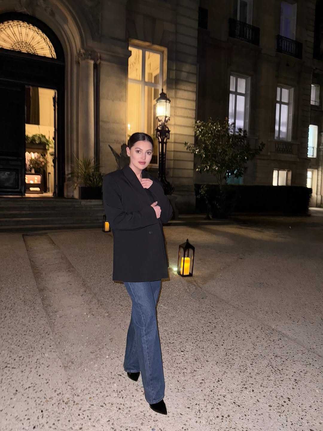في أجواء باريس، اختارت دانا الحلاني المزج بين الرسمية والعفوية عبر بليزر أسود أوفر سايز مع بنطال جينز واسع. هذا التوازن يمنح إطلالة مثالية للعشاء أو السهرات الهادئة. واعتمدت حذاءً مدببًا ومكياجًا طبيعيًا مع شعر مشدود للخلف، لتبدو الإطلالة بسيطة لكن واثقة.