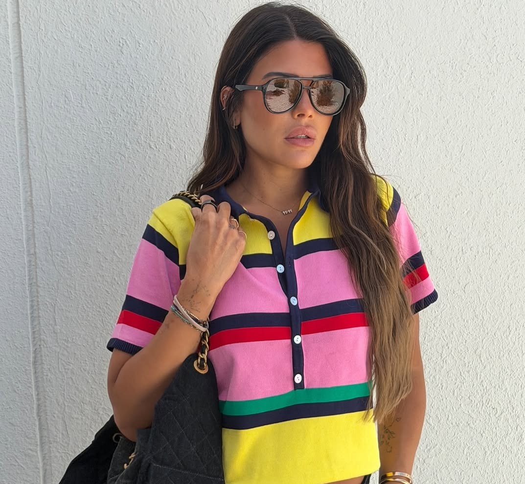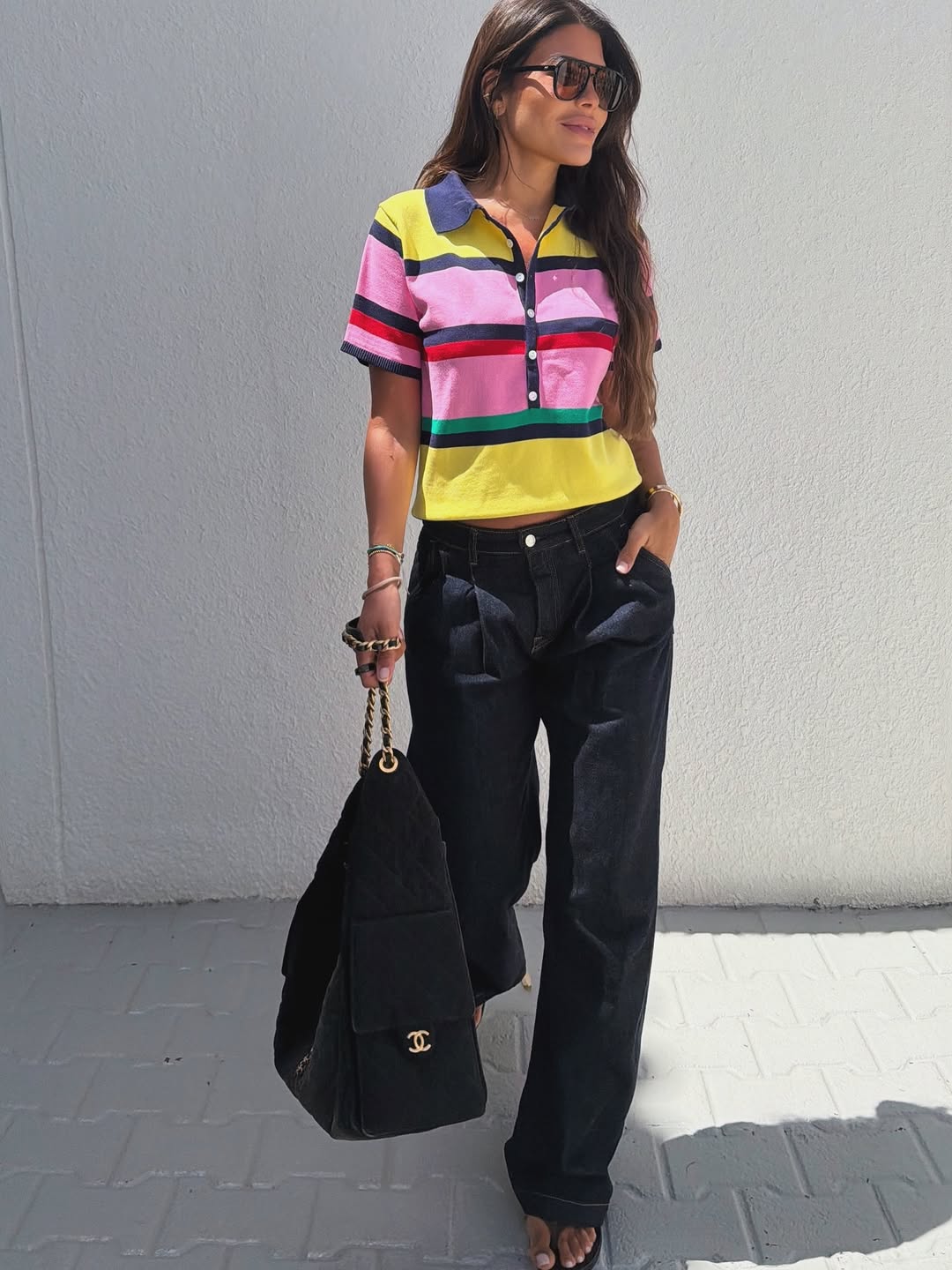 اختارت العنود بدر قميص بولو ملون بخطوط زاهية جمعت بين الوردي والأصفر والأخضر، في إطلالة نابضة بالحيوية. ونسقته مع بنطال جينز واسع باللون الأسود، ما خلق توازنًا بين الألوان القوية والقاعدة المحايدة. هذا النوع من التنسيقات مثالي لنزهات النهار والتسوق، خاصة مع مكياج برونزي ناعم وشعر منسدل ونظارات شمسية عريضة.