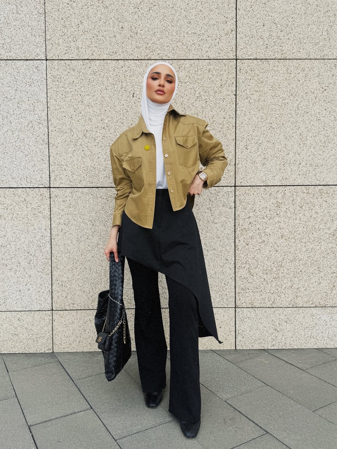 قدمت دلال الدوب فكرة مبتكرة عبر تنورة جانبية فوق بنطال أسود، مع جاكيت قصير باللون الزيتي، لتمنح الإطلالة طبقات عصرية (Layering) تجمع بين الاحتشام والموضة. وأكملت اللوك بحجاب أبيض نقي وحقيبة كبيرة، ما جعل الإطلالة عملية وأنيقة في الوقت نفسه.