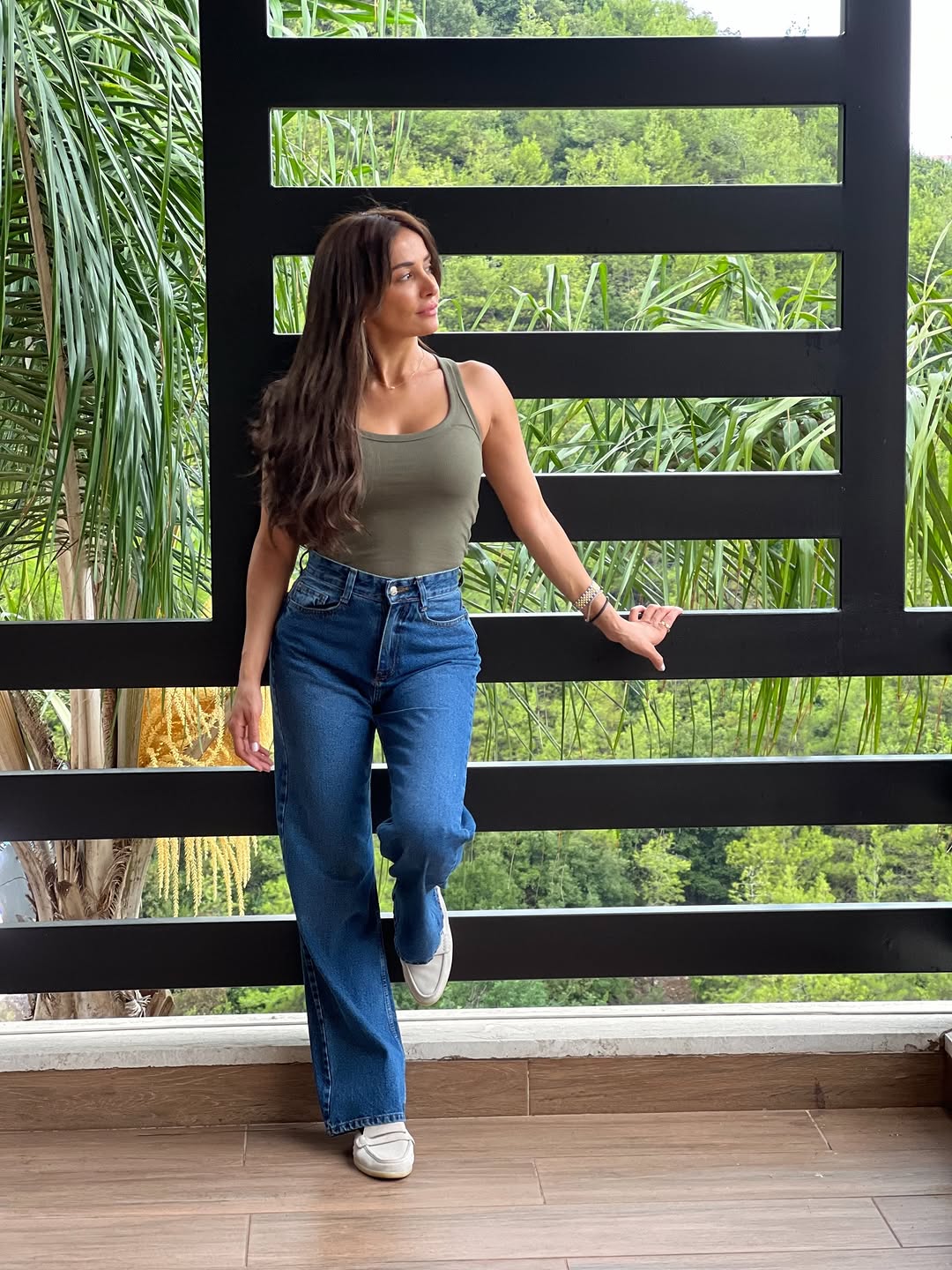 في إجازتها في لبنان، ظهرت كندة حنا بإطلالة كاجوال تعتمد على توب زيتي مع بنطال جينز عالي الخصر بقصة مستقيمة. وفضلت البساطة في كل التفاصيل، من الشعر المنسدل والمكياج الناعم إلى الحذاء المسطح، ما جعل الإطلالة مريحة ومتناغمة مع أجواء الطبيعة.