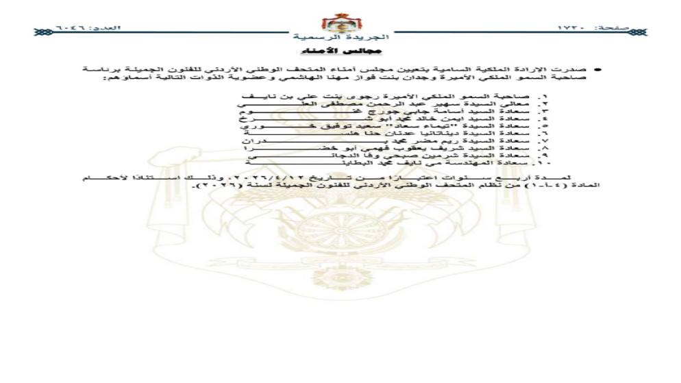 للعلّم - صدرت الإرادة الملكية السامية بتعيين مجلس أمناء المتحف الوطني الأردني للفنون الجميلة برئاسة صاحبة السمو الملكي الأميرة وجدان بنت فواز مهنا الهاشمي، وفقا للجريدة الرسمية في عددها الصادر الخميس.