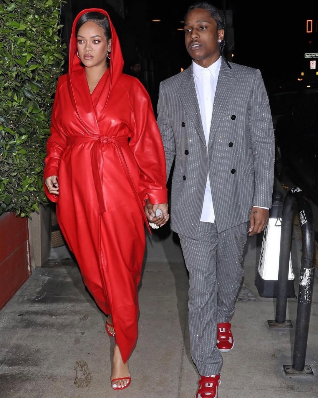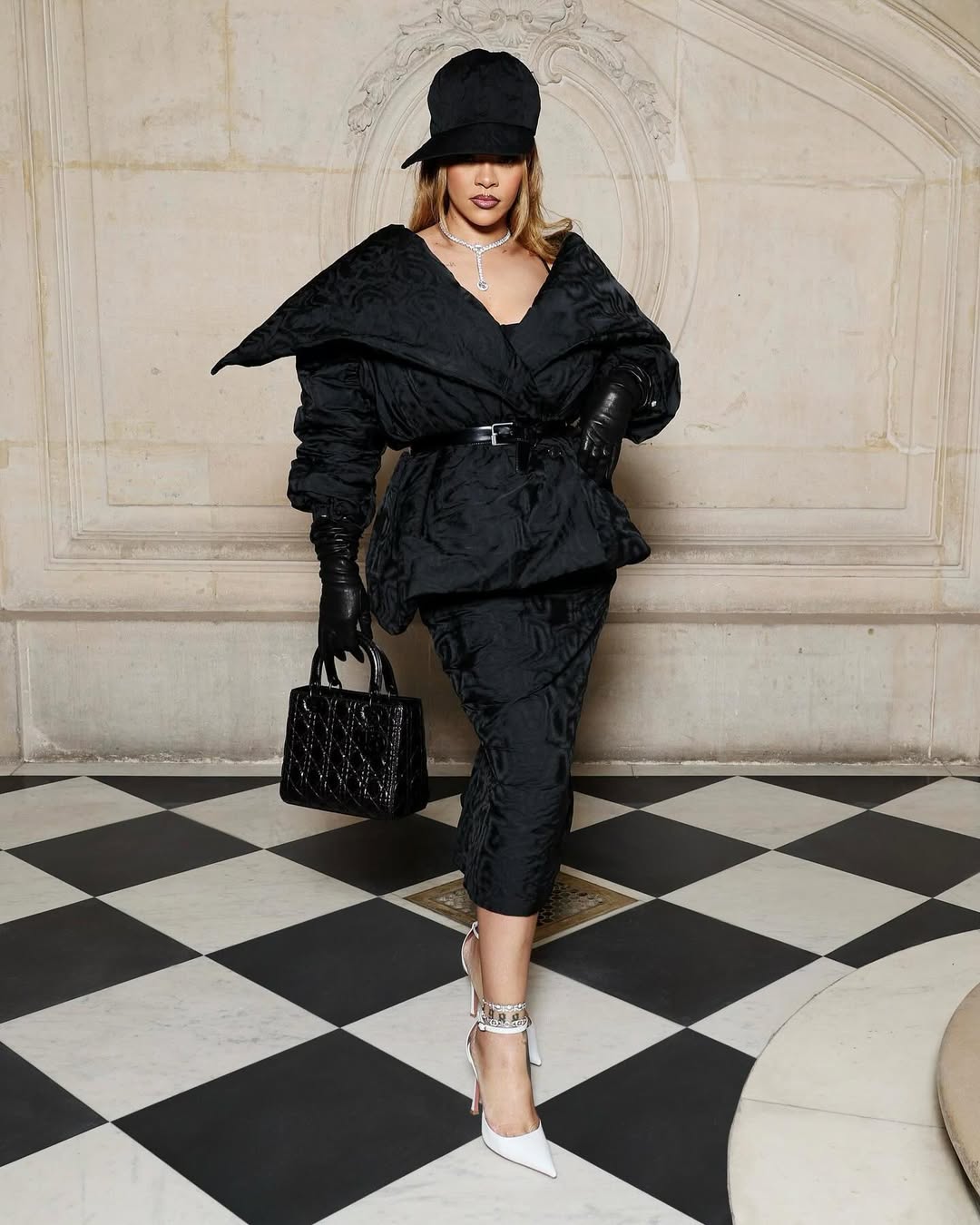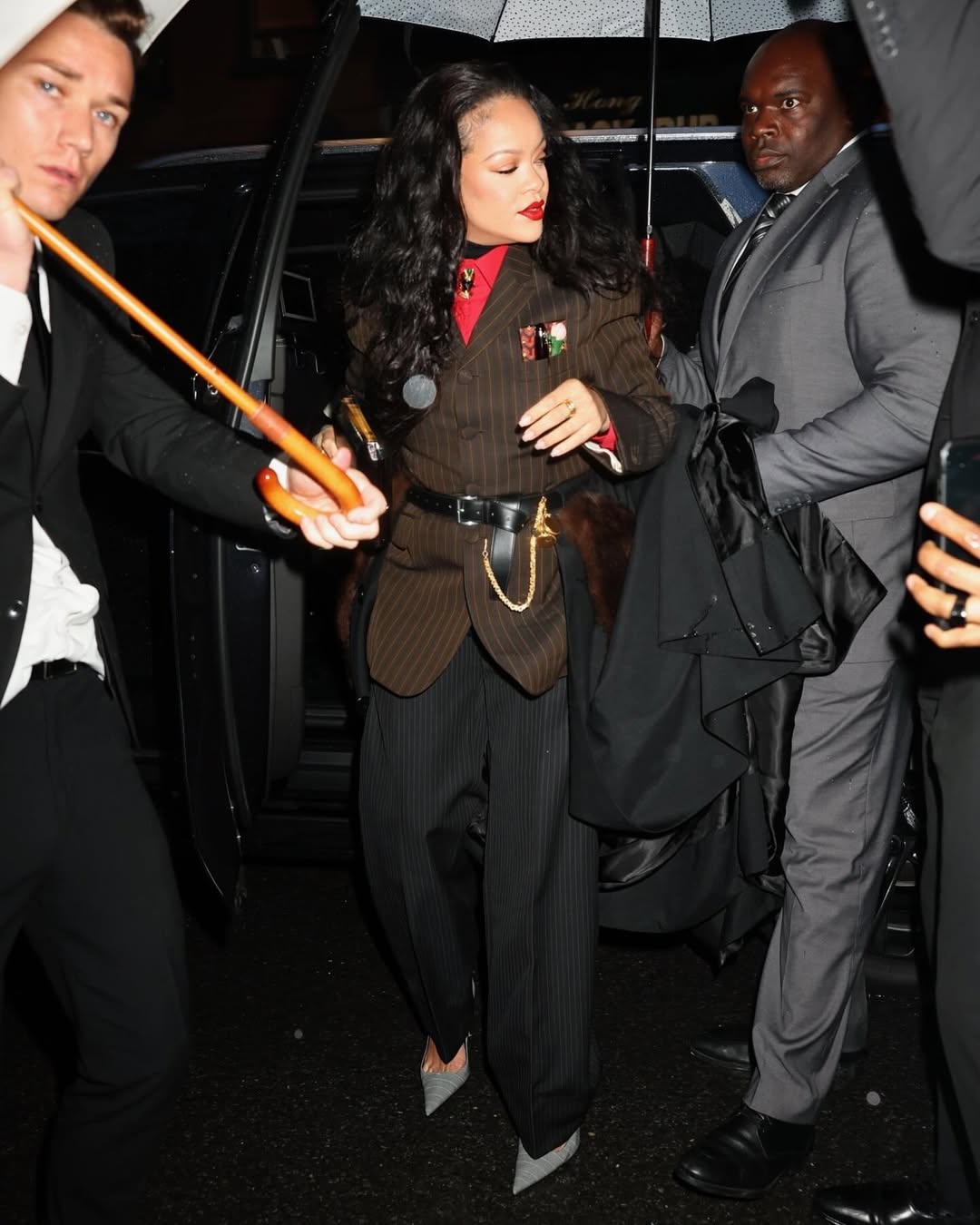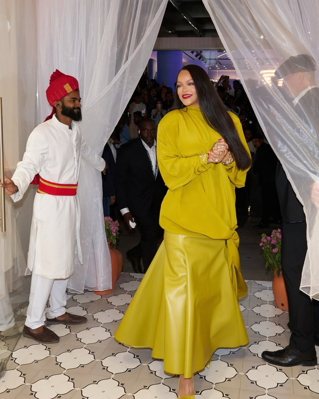 اختارت ريهانا إطلالة كاملة باللون الأصفر من توقيع Mugler، جمعت فيها بين تنورة جلدية ماكسي وبلوزة واسعة بأكمام طويلة وياقة عالية. رغم الطابع المحتشم، إلا أن قوة اللون والخامات منحت الإطلالة حضوراً صاخباً لا يمكن تجاهله.