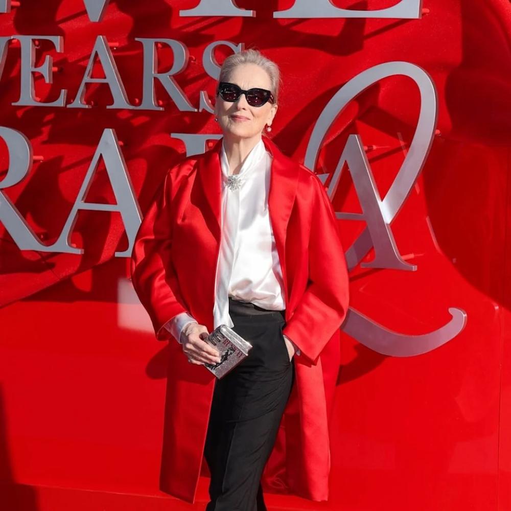 في لندن، أثبتت ميريل ستريب أن الأناقة لا تحتاج إلى صخب. اختارت إطلالة كلاسيكية بلمسة عصرية: بنطال أسود مع قميص حريري وجاكيت أوفر سايز باللون الأحمر. وفي ظهور آخر، تألقت ببدلة حمراء بقصة محددة للخصر، جمعت بين القوة والأنوثة، بأسلوب يعكس خبرة طويلة في فهم قواعد الموضة… وكسرها عند الحاجة.