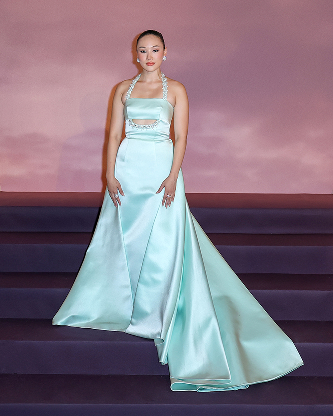 سفيرة برادا سادي سينك تألقت بثوب أخضر شاحب بقصة سترابلس مع كورسيه مكشوف الظهر وتنورة منتفخة. التصميم جمع بين الطابع الكلاسيكي والروح الشبابية، خاصة مع مجوهرات Bvlgari التي أضافت بريقًا فخمًا.
