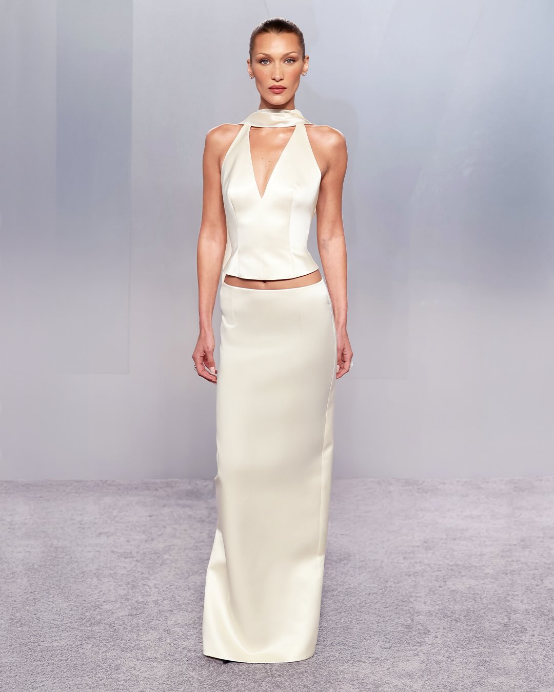 بيلا حديد اختارت طقمًا حريريًا عاجيًا يجمع بين تنورة طويلة وتوب بفتحة هالتر، مع وشاح منسدل خلف الظهر. الإطلالة بدت ناعمة لكنها مدروسة بعناية، تؤكد أن البساطة حين تُتقن تتحول إلى توقيع شخصي.