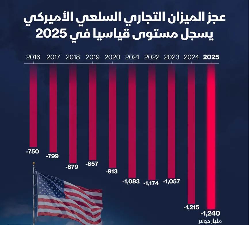عجز تجارة السلع الأميركية يقفز 65% خلال عقد ويسجل رقماً قياسياً